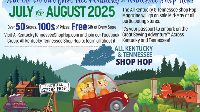 The All Kentucky Tennessee Shop Hop is coming to Kentucky and Tennessee for the inaugural event during the months of July and August, 2025. It offers the opportunity to explore 50+ stores in two states during the event. You can start your adventure by picking up the All Kentucky Tennessee Shop Hop Magazine at The Kentucky Quilt Company. This is a great resource to help you navigate the Shop Hop and something you can use all year long as you travel throughout the state. The magazine contains the “passport” that you can fill with stamps/stickers from the participating shops. You can then enter the passport into a drawing for prizes!